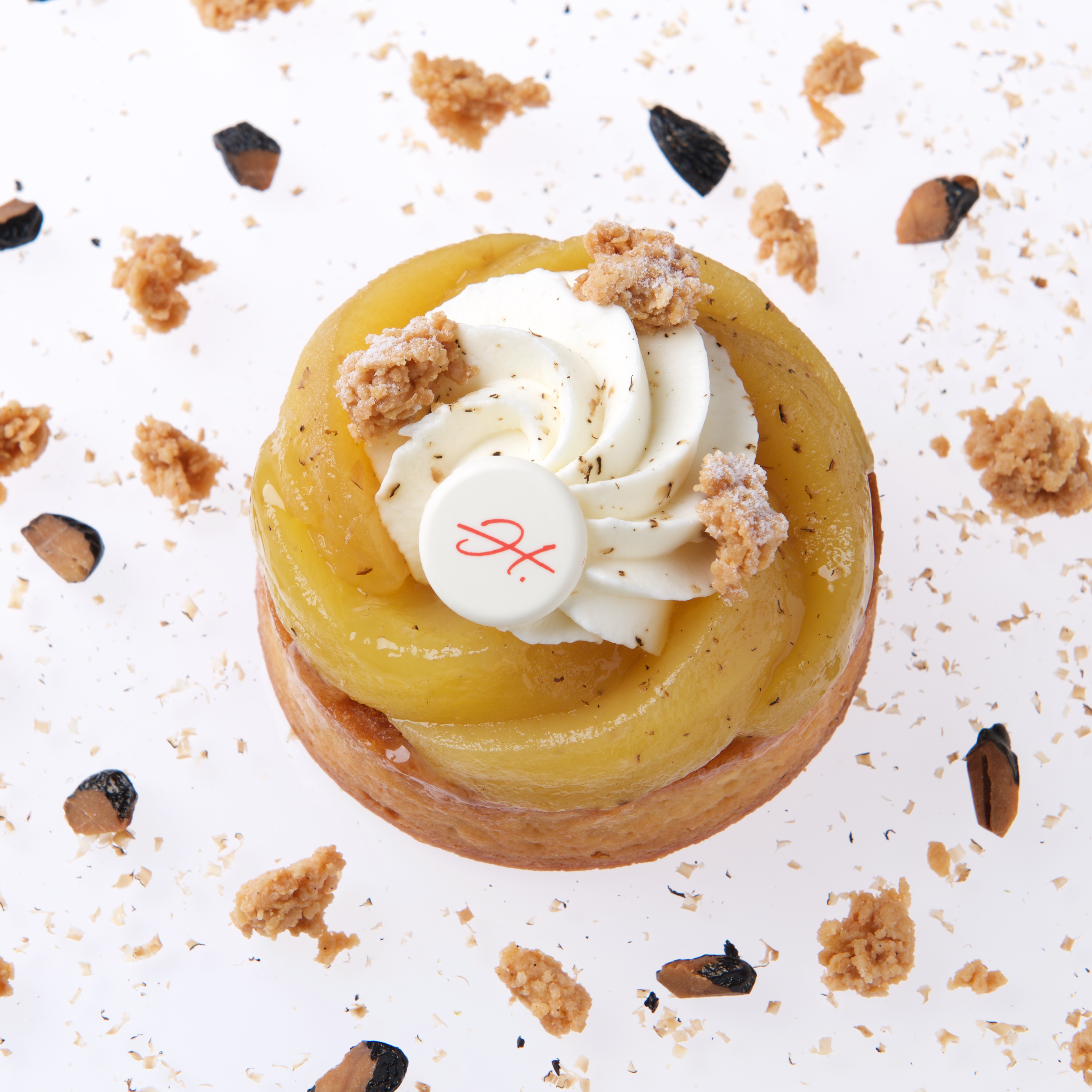 Pommes rôties, crème légère « Philadelphia » saupoudré de fève de Tonka râpée sur un fond de pâte sablée croustillante à la crème d’amande